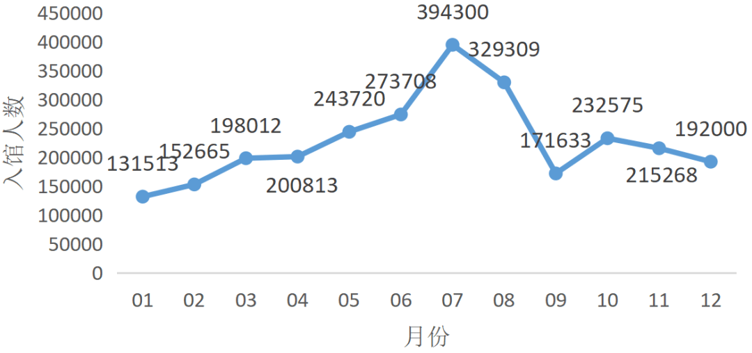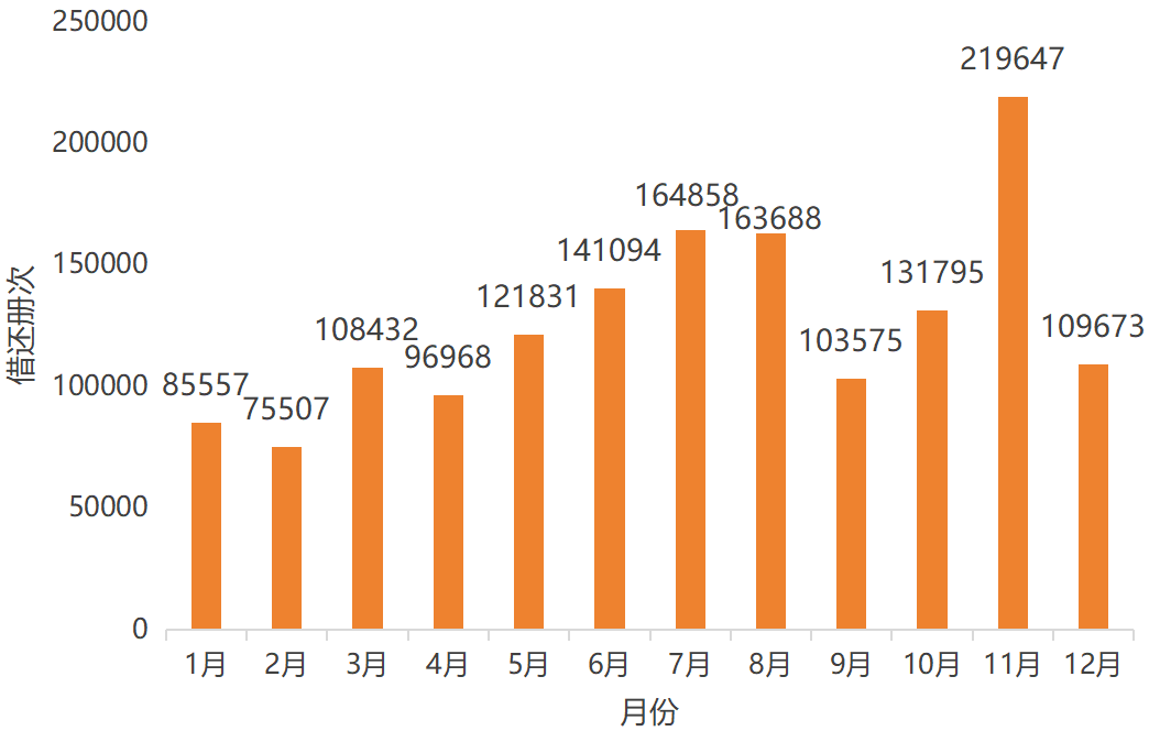 11月是借阅最火爆的月份,借还量接近22万册次;暑假的7、8月也是借阅高峰,分别有16.5万和16.4万册次。
