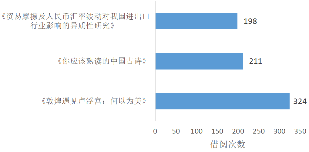《敦煌遇见卢浮宫:何以为美》累计借阅324次、《你应该熟读的中国古诗》累计借阅211次、《贸易摩擦及人民币汇率波动对我国进出口行业影响的异质性研究》累计借阅198次。