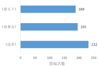 《读者》累计借阅232次、《故事会》累计借阅195次、《看天下》累计借阅188次。